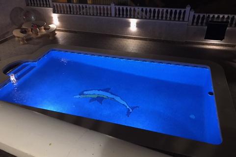 Pool Renovation - Repair of minor cracks. Complete retiling with decorative border and dolphin floor design. Installation of LED remote control coloured lights.