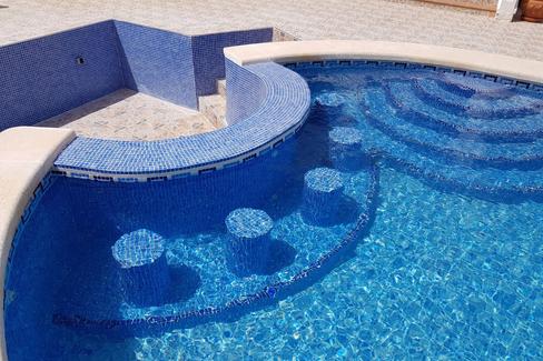 The steps were removed and a swim up bar constructed with 5 stools. New steps were created. The pool was also regrouted and LED remote control coloured lights were installed.